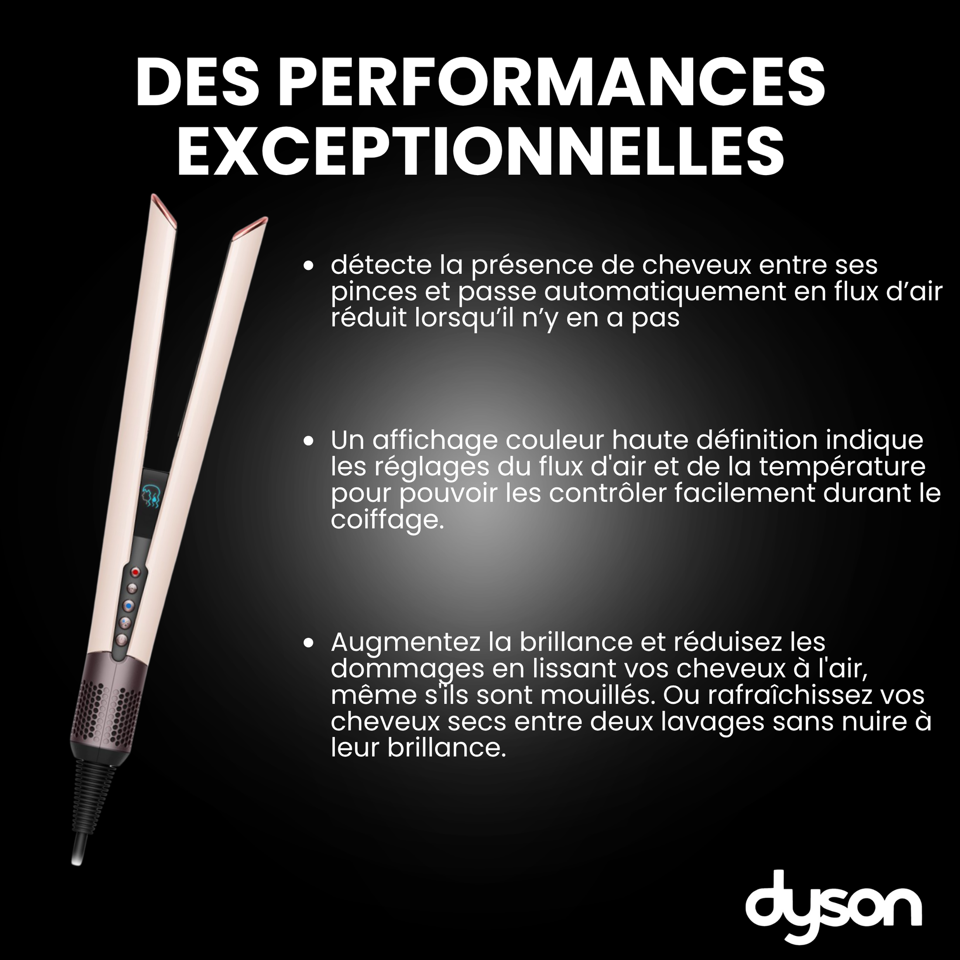 Caractéristiques: Sèche et lisse en même temps, grâce à l’air - Sans plaques chauffantes - Sans dommages thermiques. Nouvelle technologie de lissage, grâce à l’air. Routine simplifiée : gain de temps avec le Dyson Airstrait™. Sélection du mode « Sec » pour coiffer ou faire des retouches sur cheveux secs. Fini lisse naturel avec volume et mouvement. Design intelligent et ergonomique.